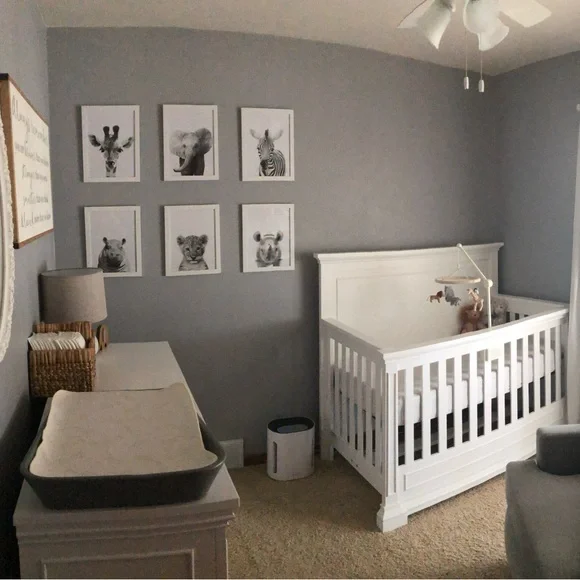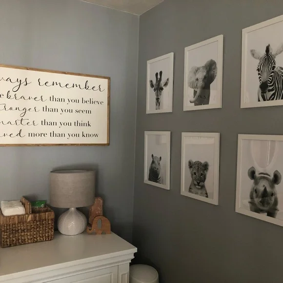 Includes:- 6 white picture frames- 6 11x14 matte black & white professional prints of six different baby safari animals (baby hippo ๐ฆ , baby elephant ๐ , baby giraffe ๐ฆ , baby lion ๐ฆ , baby zebra ๐ฆ , baby rhino ๐ฆ)I used these for a boho safari theme gender neutral nursery. I bought these images, got them professionally printed, & framed them.Dimensions: 15.25โ x 12.25โ per frameOne frame does have a small crack but it is not noticeable when it is holding a picture as it is on the backside. See pic 5. The material is either tempered glass or plastic and the crack does not affect the structural integrity of the frame and is not sharp. These type of frames are very safe for a nursery or childrenโs room.Tags: nursery decor, playroom, kids room, poster, wall art, home decor, baby girl room, baby boy room, gender neutral, minimal, modern, gallery wall, boho, toddler, child